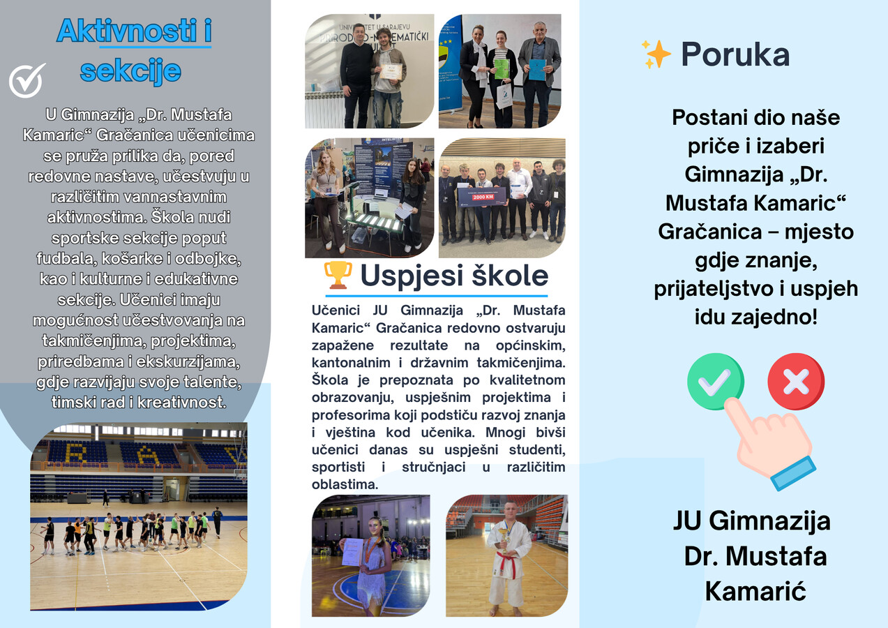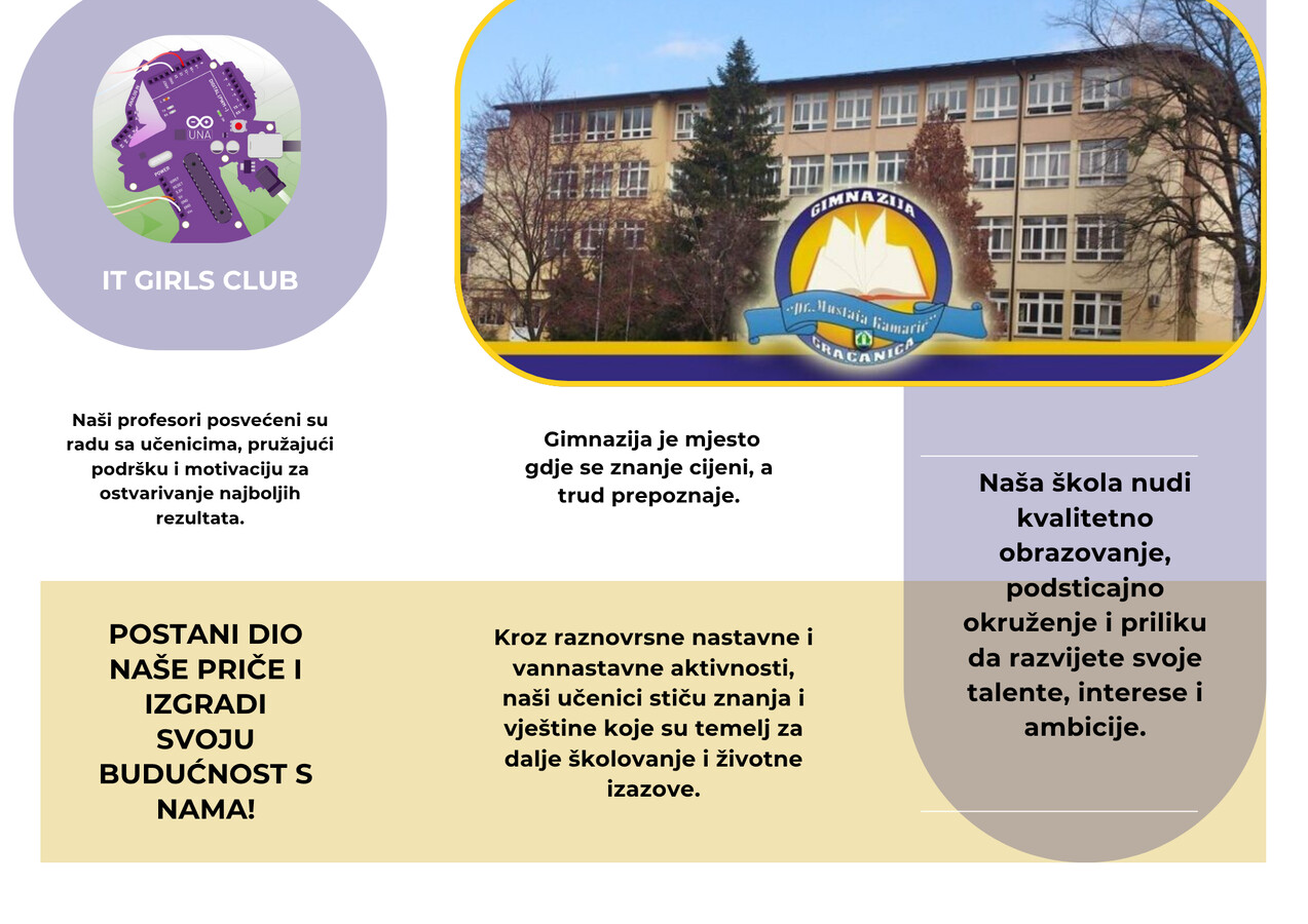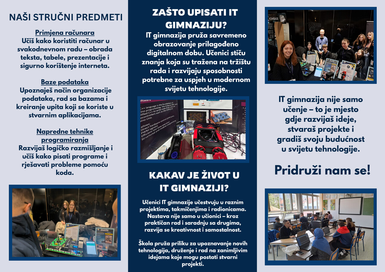 Iako zahtjevna, gimnazija će od svakog vas tražiti da prije svega pronađete najjači vlastiti potencijal. U društvu brzog tehničkog i tehnološkog razvoja u kojem živimo znanje postaje pitanje od ekonomske, političke i kulturološke važnosti. Stoga je vaša sposobnost primjene znanja u praksi ključna kompetencija za moderno društvo. Međutim, nije dovoljno samo tehničko znanje i praksa, zar ne?